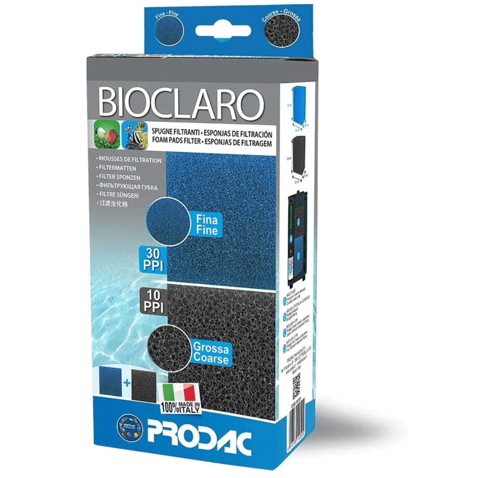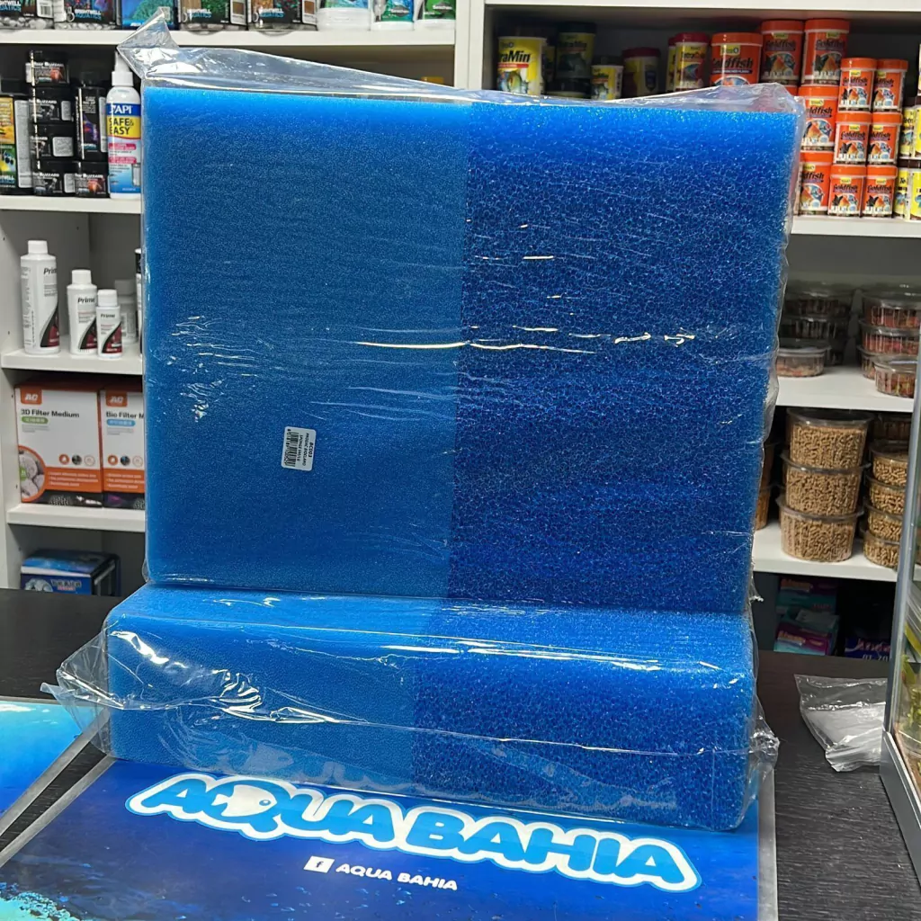 El paquete contiene dos esponjas, una de porosidad fina (30 ppi, color azul) y otra de porosidad gruesa (10 ppi, color negro) para la filtración biológica y/o mecánica para acuarios de agua dulce o marina y terrarios.
